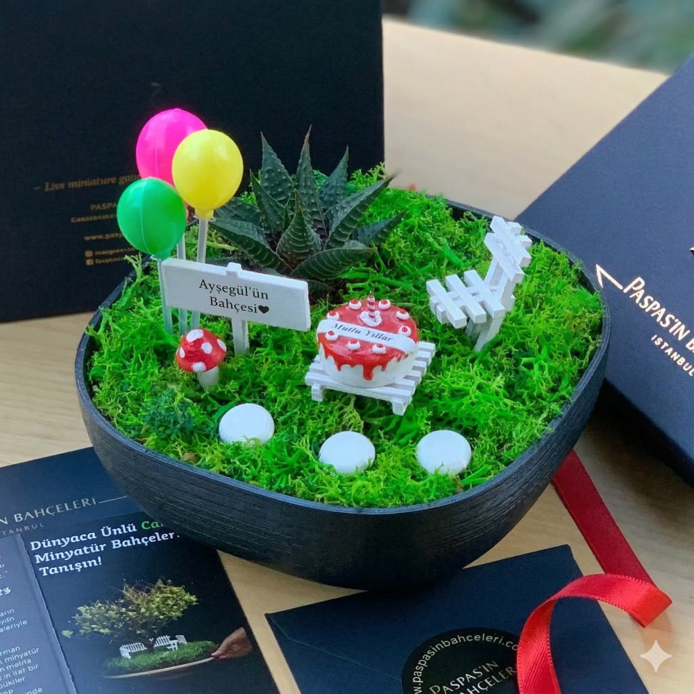 Aksesuarlar : El yapımı ahşap sandalye ve sehpa, sehpa üzerinde el yapımı minyatür pasta, minyatür kırmızı mantar, 3 adet minyatür renkli balon, isme özel hazırlanan ahşap bahçe tabelası, minyatür çakıl taşları. (Tüm aksesuarlar fiyata dahildir. Çilekli, çikolatalı ya da limonlu pasta seçeneklerimiz vardır. Balon renkleri stok durumuna göre farklılık gösterebilir.)