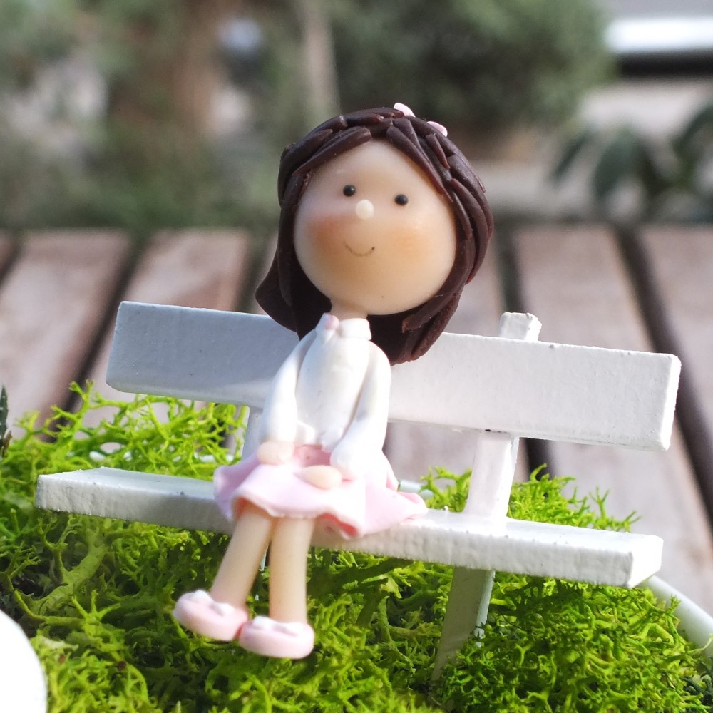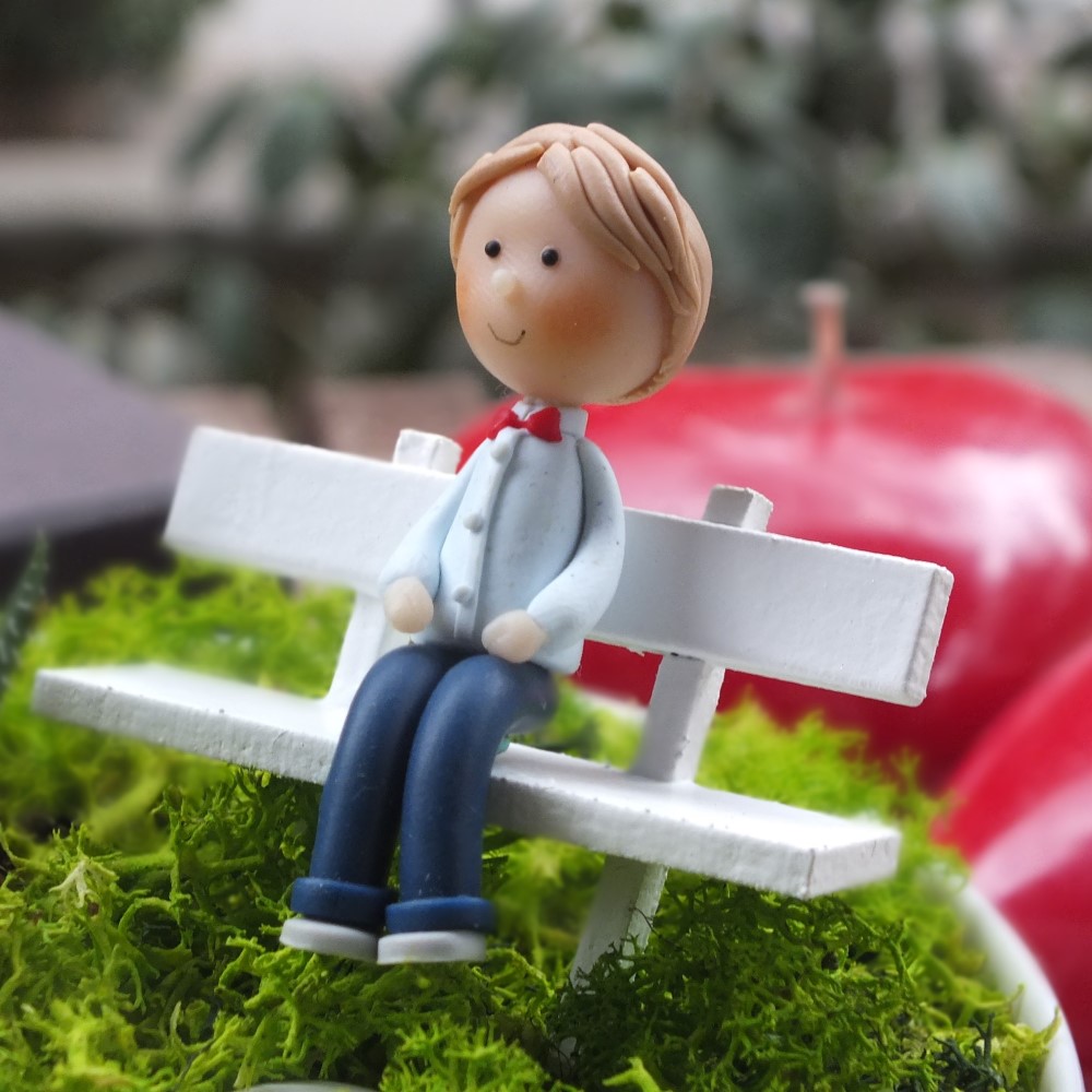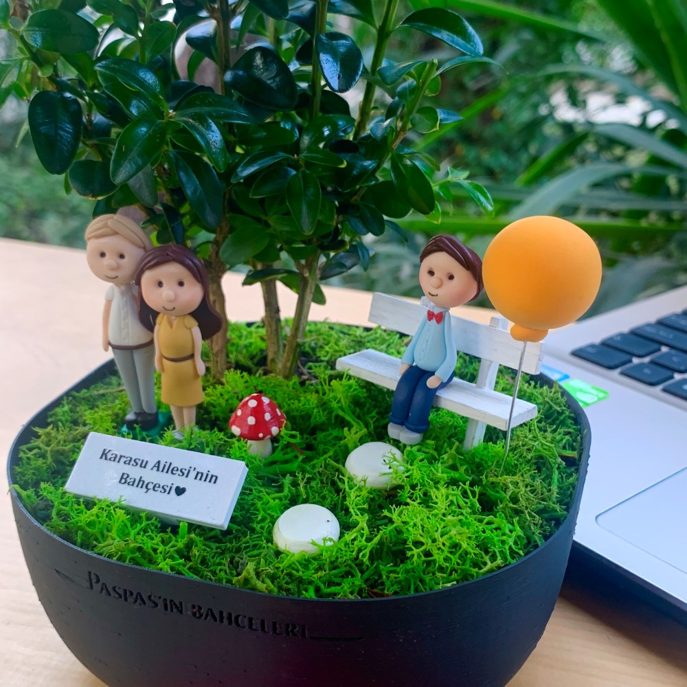 Aksesuarlar : El yapımı ahsap bank ve bankta oturan çocuk figürü. Zeminde kırmızı mantar ve çakıl taşları ile isme özel hazırlanan ahşap bahçe tabelası. 2 adet el yapımı polimer kil figür. 1 adet minyatür balon. (Tüm aksesuarlar fiyata dahildir. Figürlerin cinsiyet ve saç rengi tercihinizi lütfen bize bildirin.)