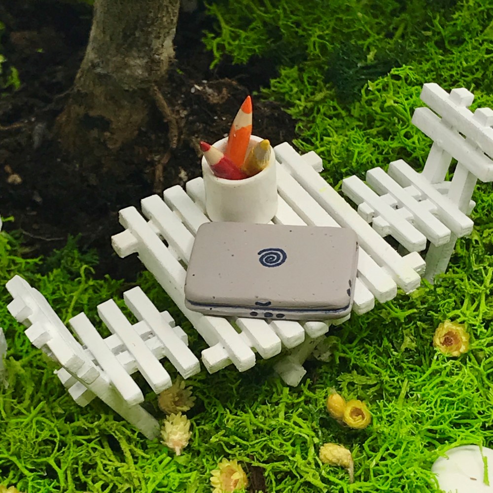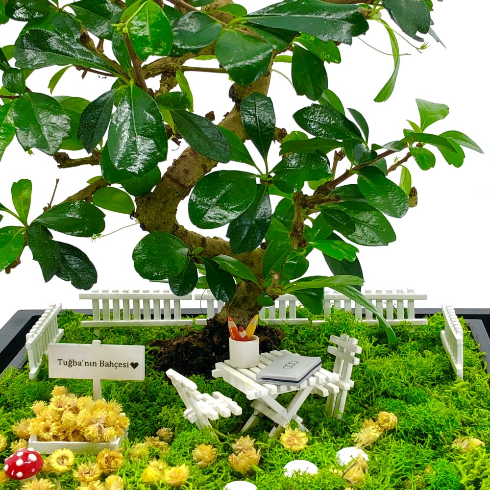 Aksesuarlar : El yapımı bahçe çitleri, masa ve sandalyeler, masa üzerinde el yapımı minyatür kalemlik ve laptop figürü. Zeminde kurutulmuş gerçek doğal çiçeklerle hazırlanan çiçek kasası, taş ve mantar figürleri ve isme özel hazırlanan ahşap bahçe tabelası (Tüm aksesuarlar fiyata dahildir)
